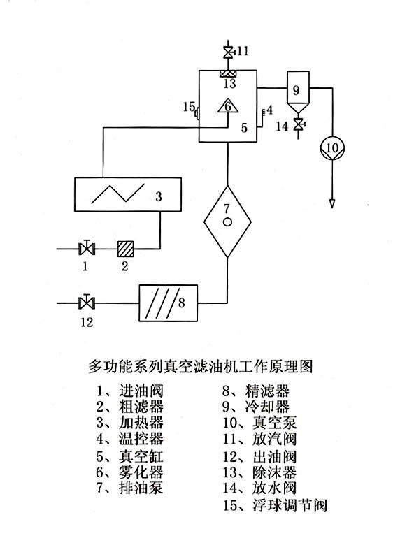 一、 概述 多功能真空濾油機(jī)主要用于電廠、電站、變電站、電器制造廠、造紙廠、電化廠、工礦企業(yè)的油品過(guò)濾。適用于過(guò)濾:透平油、絕緣油、冷凍油及30號(hào)以下的機(jī)械油中的水份、氣體和雜質(zhì)。 多功能系列真空濾油機(jī),我們積國(guó)內(nèi)外先進(jìn)經(jīng)驗(yàn),采用自己研制的油水霧化器和風(fēng)冷卻技術(shù)、升級(jí)加熱器、有先進(jìn)的脫水、脫氣裝置和高效除酸再生裝置及精密過(guò)濾器和粗濾器、溫度控制器等組成的一體化油處理先進(jìn)設(shè)備。具有脫氣脫水、除機(jī)械雜質(zhì)、膠體顆粒、酸性物質(zhì)等功能。主要適用于透平油、變壓器油和30﹟以下的機(jī)械油凈化和再生。為了滿足用戶的使用方便,本設(shè)備正常是單獨(dú)使用,利用真空脫氣、脫水裝置及粗精過(guò)濾器對(duì)油處理凈化。如果使用廠家的油品乳化,我們可根據(jù)廠家要求,根據(jù)不同情況增配不同的再生裝置共同使用。 為了提高真空濾油機(jī)的性能和可靠性,我們采用了自己研制的升級(jí)加熱系統(tǒng),高效油水霧化系統(tǒng)、風(fēng)冷卻系統(tǒng),既可以除去大量的水份和不同的雜質(zhì),又可以延長(zhǎng)機(jī)械使用壽命。溫度采用自動(dòng)化電路控制。排油泵采用浮球自動(dòng)化控制系統(tǒng)。結(jié)構(gòu)緊湊、操作方便、體積小、實(shí)用性強(qiáng)、經(jīng)濟(jì)效果明顯、節(jié)能極佳深受用戶好評(píng)。 二、 結(jié)構(gòu)及工作原理 多功能系列真空濾油機(jī)主要由粗濾器、加熱器、真空缸、霧化器、真空泵、排油泵、冷卻器、溫度控制器、破沫器,精密過(guò)濾器和電器控制等部件組成。由于使用廠家的條件和要求不同,真空濾油機(jī)還可增配除酸脫色吸附裝置一體化運(yùn)行。 開(kāi)動(dòng)真空泵系統(tǒng),真空表的負(fù)壓達(dá)到-0、06Mpa時(shí)可以打開(kāi)進(jìn)油閥(1),待凈化油液從主油箱進(jìn)入粗濾器(2),經(jīng)過(guò)粗濾器除去油中的較大水顆粒和雜質(zhì)。粗凈化的油進(jìn)入加熱器(3),加熱后的油液進(jìn)入真空缸(5),再通過(guò)霧化器(6),在一定的溫度和真空條件下、油水充分霧化、水份蒸發(fā)向上、油液降下、油中所含的水份和氣體霧化后被真空泵抽出。進(jìn)入冷卻器(9),通過(guò)冷卻的蒸汽,部分被冷卻成水,部分未冷卻成水,但降溫后被真空泵(10)抽出,從排氣口排出。時(shí)刻要觀察真空缸的油位,當(dāng)油位達(dá)到觀察孔中心時(shí),可以將排油的主令開(kāi)關(guān)旋至自動(dòng)上即可,當(dāng)真空缸油達(dá)到高油位時(shí),排油泵自動(dòng)排油,當(dāng)油位達(dá)到低油位時(shí)自動(dòng)停泵?扛∮驼{(diào)節(jié)閥(15)控制排油泵,排油泵將油液從真空缸打入精濾器(8)除去微粒雜質(zhì)后排入主油箱,排油時(shí)必須提前打開(kāi)排油閥(12)。 三、 規(guī)格性能 (一) 系列多功能真空濾油機(jī)的型號(hào)和技術(shù)參數(shù)表[見(jiàn)表]