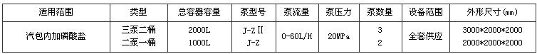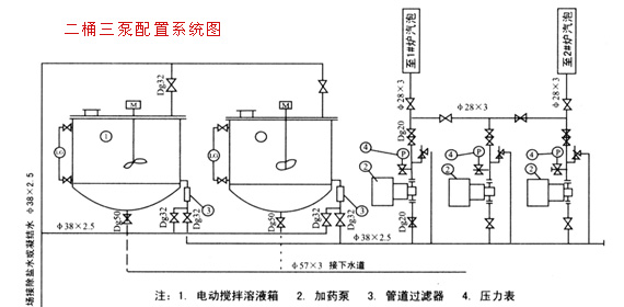 本裝置適用于火力發(fā)電廠300MW及以下機(jī)組氣包內(nèi)加磷酸鹽處理,為二臺爐用一套設(shè)備,共設(shè)三臺加藥泵,其中一臺為備用,為單元制運(yùn)動。