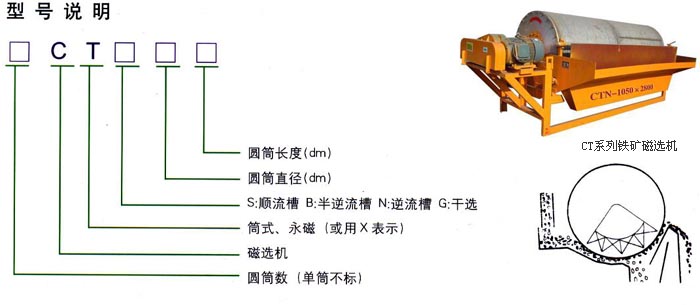 一、概述: 永磁筒式磁選機適用于礦山、選煤廠等單位,用于弱磁場濕式選別細顆粒的強磁性礦物,或者除去非磁性礦物中混雜的強磁性礦物。 該機有三種槽體:半逆流槽(CTB);順流槽(CTS)和逆流槽(CTN),分別適用于不同選別顆粒度及不同選別工藝的要求。 我公司產(chǎn)品的特點是:采用計算機優(yōu)化設計,磁路合理并嚴格選用高矯頑力,高剩磁的永磁體,確保磁性在長時間內(nèi)不降低,保障用戶的長遠利益,整體結(jié)構可靠耐用,分別適用于不同選別顆粒度及不同選別工藝的要求。 該機是專門為重介質(zhì)選煤廠回收磁性介質(zhì)設計的全逆筒式磁選設備。該系列設備的磁場的分布特征有利于微細粉的最大回收效果,巧妙設計了分選設備中產(chǎn)生合理礦漿流向的相應結(jié)構,使磁性礦物的回收率大大提高,該設備對物料流量、濃度等參數(shù)變化的適應性強,廣泛用于重介質(zhì)選煤廠。 工作原理: 該類設備利用永磁磁系所產(chǎn)生的磁力,將礦漿中的磁性礦物吸引到圓筒表面上來,并隨著圓筒一起旋轉(zhuǎn),待脫離磁場作用后在重力、(刮板)作用下,排出機外,而非磁性物料從尾礦口排除,完成分選作用。