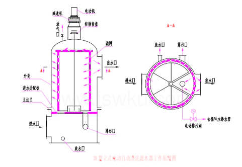 水從立式清洗全自動濾水器下部的進(jìn)水口進(jìn)入進(jìn)水室,進(jìn)水室上部有一塊進(jìn)水板,進(jìn)水板上開有一個弧形孔,水從弧形孔進(jìn)入圓柱形濾網(wǎng)的內(nèi)側(cè),在圓柱形濾網(wǎng)的表面開了若千小孔,水從濾網(wǎng)內(nèi)側(cè)流到濾網(wǎng)外側(cè),雜質(zhì)被擋在濾網(wǎng)內(nèi)側(cè),隨著運(yùn)行時間的延續(xù),濾網(wǎng)內(nèi)側(cè)壁上雜物越積越多。濾網(wǎng)內(nèi)側(cè)有4-8塊隔板,上圖為6塊隔板,它把濾網(wǎng)內(nèi)側(cè)分隔成6個獨(dú)立的扇形小室,其中s個扇形小室與進(jìn)水板的弧形進(jìn)水孔相通,起過濾作用,進(jìn)水板上除開設(shè)弧形孔外,還開設(shè)了一個排污孔,排污孔與通向循環(huán)水排水管的排污管相連,排污管上裝設(shè)一個電動排污閥,當(dāng)電動排污閥開啟時,在與排污孔相對應(yīng)的一個扇形小室中,水從濾網(wǎng)的外側(cè)流向?yàn)V網(wǎng)的內(nèi)側(cè),通過排污管流向循環(huán)水排水管。 通過控制箱面板上計(jì)時器的設(shè)置,濾網(wǎng)能定期順時針轉(zhuǎn)過60*,即一個獨(dú)立扇形小室與排污孔相通,濾網(wǎng)內(nèi)側(cè)的雜物由濾網(wǎng)外側(cè)的水沖入排污管,對這個扇形小室的濾網(wǎng)表面進(jìn)行清洗,清洗時間為2~8分鐘,然后再轉(zhuǎn)過60。重復(fù)以上過程,系統(tǒng)每小時(可調(diào))自動清洗一次濾網(wǎng)。 如果水質(zhì)不太臟,為了節(jié)約用水,可實(shí)現(xiàn)間斷清洗,正常運(yùn)行時可不打開電動排污閥,根據(jù)水質(zhì)情況定期啟閉排污閥。本設(shè)備的控制系統(tǒng)可整定電動排污閥每隔2-8小時開啟一次,每次開啟的時間為10-60分鐘,從而完成間斷清洗的功能。 當(dāng)垃圾較多時,可采用連續(xù)反沖洗,通過把控制器面板上反沖洗開關(guān)置于開啟位置來觸發(fā)。本設(shè)備的控制系統(tǒng)可根據(jù)水質(zhì)情況任意調(diào)節(jié)排污時間。 工作方式:自動和手動。 自動控制模式采用時間控制模式。系統(tǒng)每8小時(可調(diào))自動清洗一次濾網(wǎng)。需要時可采用手動控制模式。當(dāng)電動機(jī)失去電源或損壞時,拔去聯(lián)軸器中方鍵可手操轉(zhuǎn)盤,實(shí)行手動清洗。 三、立式清洗全自動濾水器主要結(jié)構(gòu): 本設(shè)備主要由筒體、濾網(wǎng)和傳動機(jī)構(gòu)三部分組成。 ㈠筒體由上下兩部分組成。下簡體為進(jìn)水室,下筒體上有排污口、放水口和進(jìn)水口,進(jìn)水板在進(jìn)水室上部,依靠主管支承在底板上。上簡體由圓筒和封頭組成,上筒體上有出水口,封頭上有一根放氣管,封頭上焊有座架,用于支承傳動裝置。上下簡體依靠法蘭連接。 ㈡濾網(wǎng)由軸、隔板和網(wǎng)板組成。軸的下端支承于軸座上,軸的上端與聯(lián)軸器相連。隔板和網(wǎng)板的材料均為1Cr18Ni9Ti,網(wǎng)板上的小孔直徑一般為中6mm,網(wǎng)板上的小孔均經(jīng)過擴(kuò)孔,表面光滑,易于清洗。 ㈢傳動機(jī)構(gòu)由電動機(jī)、行星擺線減速機(jī)和聯(lián)軸器組成。聯(lián)軸器中有根方鍵,當(dāng)電動機(jī)失去電源或損壞時,拔去方鍵可手操轉(zhuǎn)盤,實(shí)行手動清洗。在聯(lián)軸器下方安裝的轉(zhuǎn)盤上,有4-8塊撞塊,它與行程開關(guān)起控制濾網(wǎng)的轉(zhuǎn)和停。 四、立式清洗全自動濾水器技術(shù)規(guī)范: 額定流量:2000、2500、3000、4000、50300、400、600、800、1000、1500、OO、6000t/h 額定流量下的阻力:sE0.02MPa 工作壓力:0.25MPa 水壓試驗(yàn)壓力:0.375Mpa 工作電壓:380V 減速機(jī)的出軸轉(zhuǎn)速:0.7-1.2r/min 排污水量不超過濾水總量的5% 五、立式清洗全自動濾水器運(yùn)行: ⑴運(yùn)行前應(yīng)檢查電動機(jī)、電動頭和控制箱的絕緣,合格后方可進(jìn)行下一步操作。 ⑵確認(rèn)濾網(wǎng)轉(zhuǎn)停時間和排污閥開關(guān)時間,如安裝后調(diào)試或大修后調(diào)試則應(yīng)調(diào)整時間繼電器,注意調(diào)整時間繼電器時必須切斷電源,不可帶電作業(yè)。 ⑶運(yùn)行前檢查減速機(jī)內(nèi)油質(zhì)、油量、合格后方可啟動。 ⑷運(yùn)行前檢查濾網(wǎng)轉(zhuǎn)動是否靈活,如發(fā)現(xiàn)卡澀或有異常聲響應(yīng)檢查原因,消缺后方可啟動。 ⑸檢查各閥門開關(guān)是否靈活。關(guān)閉出水閥、電動排污閥、放水閥,開啟進(jìn)水閥和放氣閥。當(dāng)放氣閥出口冒水后關(guān)閉放氣閥。 ⑹向?yàn)V網(wǎng)電動機(jī)送電,觀察濾網(wǎng)旋轉(zhuǎn)是否平穩(wěn),行程開關(guān)與轉(zhuǎn)盤上的撞塊位置是否吻合,濾網(wǎng)的轉(zhuǎn)停時間是否達(dá)到要求,如不符要求則應(yīng)停止運(yùn)行,并予消缺。 ⑺開啟出水閥,檢查濾網(wǎng)運(yùn)轉(zhuǎn)是否平穩(wěn),填料處有無漏水,如有漏水應(yīng)擰緊填料蓋螺母,做到濾網(wǎng)轉(zhuǎn)動正常,填料處不漏水。 ⑻檢查電動排污閥開閉時間是否符合要求。 ⑼啟動冷卻水升壓泵后,應(yīng)對立式清洗全自動濾水器再做一次全面檢查,如無異常情況,則立式清洗全自動濾水器進(jìn)入正常運(yùn)行狀態(tài)。 ⑽立式清洗全自動濾水器停役后,關(guān)閉進(jìn)出水閥和電動排污閥,開啟放水閥和放氣閥。放空存水,以免冬季結(jié)冰脹壞管子。如作為運(yùn)行備用,則可不必開啟放水閥和放氣閥。 六、立式清洗全自動濾水器安裝維護