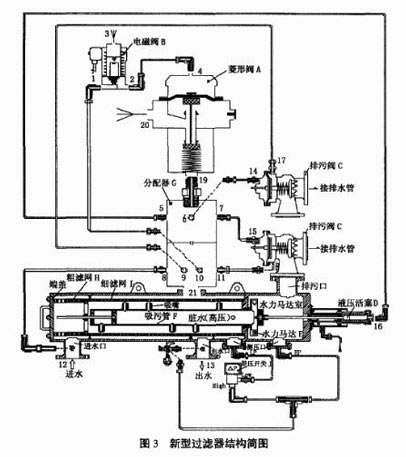 圖2全自動(dòng)自清洗式過濾器外形圖新過濾器的型號(hào)為AF-816,工作壓力為2.5MPa,過濾精度3mm,設(shè)計(jì)流量2500m3/h,其結(jié)構(gòu)簡圖見圖3所示。 新型過濾器的工作過程臟水從過濾器的進(jìn)口[12]流入,并從外向內(nèi)流過粗濾網(wǎng)[H](粗濾網(wǎng)的作用是攔截一些比較大的雜質(zhì),保護(hù)細(xì)濾網(wǎng))后,進(jìn)入細(xì)濾網(wǎng)[I]。水通過細(xì)濾網(wǎng)由內(nèi)向外流出時(shí),雜質(zhì)積累在濾網(wǎng)內(nèi)表面并形成“濾餅”,這將產(chǎn)生一定的水頭損失,當(dāng)細(xì)濾網(wǎng)內(nèi)外的壓差達(dá)到預(yù)設(shè)值(0.5bar,7psi)時(shí),過濾器開始啟動(dòng)一次自動(dòng)清洗過程。濾網(wǎng)內(nèi)的清洗裝置即吸吮清掃器進(jìn)行螺旋式的吸吮運(yùn)動(dòng)將濾網(wǎng)上的雜質(zhì)吸走,并經(jīng)過排污管排出,潔凈水流出過濾器出口[13]。整個(gè)清洗過程耗時(shí)約為8~15s,依據(jù)實(shí)際的壓力而定,清洗時(shí)系統(tǒng)不斷流。 自動(dòng)清污工作原理: (1)緩慢打開過濾器的進(jìn)水和出水閥門,確認(rèn)工作壓力沒有異常。 (2)過濾器自動(dòng)運(yùn)行時(shí),水由進(jìn)水口[12]進(jìn)入,首先經(jīng)過粗濾網(wǎng)[H]過濾掉較大顆粒的雜質(zhì),然后到達(dá)細(xì)濾網(wǎng)[I],再從出水口[13]流出。在過濾過程中,細(xì)濾網(wǎng)[I]逐漸累積水中的臟物、雜質(zhì),形成過濾雜質(zhì)層,由于雜質(zhì)層堆積在細(xì)濾網(wǎng)[I]的內(nèi)側(cè),因此在細(xì)濾網(wǎng)[I]的內(nèi)、外兩側(cè)就形成了一個(gè)壓差。 (3)當(dāng)這個(gè)壓差[△P]達(dá)到預(yù)設(shè)值時(shí),壓差開關(guān)[J]接點(diǎn)動(dòng)作使電磁閥[B]動(dòng)作,將開始自動(dòng)清洗過程,此間不斷流:菱形閥[A]的上部控制腔接口[4]通過電磁閥[B]的[2-1]接口接壓力水,使菱形閥[A]的接口[19]與排水口[20]連通,排污閥[C]的上腔接口[14]和[15]通過分配器[G]的接口[6、7]接菱形閥的接口[19-20]而排水,排污閥[C]隔膜下部接口[17]和[18]通過分配器的接口[9、11]接壓力水,排污閥打開;液壓活塞[D]的控制接口[16]通過分配器[G]的接口[5]釋放壓力并將水從菱形閥[A]的接口[20]排出,液壓活塞[D]向右運(yùn)動(dòng);由于排污閥[C]打開,因此水力馬達(dá)室及吸污管[F]內(nèi)的壓力大幅度下降,由此通過吸嘴及水力馬達(dá)室外端產(chǎn)生一個(gè)吸污過程。當(dāng)水流經(jīng)水力馬達(dá)[E]時(shí),帶動(dòng)吸污管[F]進(jìn)行軸向運(yùn)動(dòng)并旋轉(zhuǎn),逐漸將污水排出。軸向運(yùn)動(dòng)與旋轉(zhuǎn)運(yùn)動(dòng)的結(jié)合可將整個(gè)濾網(wǎng)內(nèi)表面完全清洗干凈。 (4)整個(gè)沖洗過程只需8~15s,細(xì)濾網(wǎng)[I]沖洗干凈后,濾網(wǎng)內(nèi)外壓差降低,壓差開關(guān)[J]接點(diǎn)動(dòng)作,控制電磁閥[B]斷電失磁,菱形閥[A]的接口[19-20]關(guān)閉,則排污閥[C]上腔通過[14、15]進(jìn)水,排污閥[C]關(guān)閉,由進(jìn)水口[12、21]補(bǔ)充的水壓會(huì)使液壓活塞[D]回到其初始位置,過濾器開始準(zhǔn)備下一個(gè)沖洗周期。過濾后的凈水由出水口[13]流出。 手動(dòng)清污工作原理 用一字螺絲刀將電磁閥[B]黃銅閥座上的螺釘順時(shí)針或逆時(shí)針旋轉(zhuǎn)90°,系統(tǒng)按照上述自動(dòng)清污的過程進(jìn)行反清洗。 新型自清洗過濾器特點(diǎn): 原理簡單利用網(wǎng)孔將顆粒物截留在濾網(wǎng)的內(nèi)表面。濾網(wǎng)采用特殊的編織工藝,最高過濾精度可達(dá)到15μm,目前國產(chǎn)的只能達(dá)到200μm以上的精度,該新型過濾器的有效過濾面積是國外同等品牌的2~3倍,是國產(chǎn)的5倍以上。其巧妙的設(shè)計(jì),用很小的吸嘴產(chǎn)生較強(qiáng)吸力。 結(jié)構(gòu)簡單: 一個(gè)本體、一套濾網(wǎng)、一套清洗機(jī)構(gòu)、一套水力控制系統(tǒng)組成一個(gè)全自動(dòng)過濾器,處理水量大,安裝占地面積小。 維護(hù) 便捷本體和端蓋使用螺栓連接,設(shè)備需要維護(hù)時(shí),只要2個(gè)人在很短時(shí)間內(nèi)就可以將其打開,打開后只要將濾網(wǎng)抽出沖洗或更換就可以。 節(jié)能 因?yàn)檫^濾器采用220 VAC電磁閥外加水力控制及水力驅(qū)動(dòng),電能消耗少,反清洗耗水量低(小于過濾水量的1%),而且在反清洗時(shí)不斷流。 耐用 過濾器本體采用的是37-2碳鋼,外表面經(jīng)噴砂及磷化處理,外涂5層環(huán)氧樹脂烤漆,漆膜厚度為200~220μm,超強(qiáng)耐腐蝕。內(nèi)表面經(jīng)噴砂及磷化處理,先涂布2層環(huán)氧樹脂4230,再涂布1層鉻酸鋅,最后再以氯化橡膠涂布,漆膜厚度為200~220μm,耐腐蝕能力非常強(qiáng)。濾網(wǎng)、吸污管、水力馬達(dá)等部件采用不銹鋼316 L制作,使用壽命長。 新型自清洗過濾器與常規(guī)過濾器比較在水電機(jī)組的技術(shù)供水系統(tǒng)上,國內(nèi)大多數(shù)電站使用的過濾器都是以電機(jī)加減速器驅(qū)動(dòng)為主,以下就是新型自清洗過濾器和電力控制電力驅(qū)動(dòng)的過濾器的一些比較,如表1所示。 |