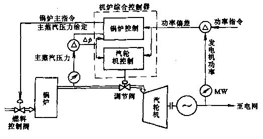 圖6-3汽輪機(jī)、鍋爐協(xié)調(diào)控制  為使中間再熱機(jī)組在負(fù)荷變化時(shí),既能利用鍋爐金屬的蓄熱滿足快速響應(yīng)外界電負(fù)荷的要求,又能通過改變調(diào)節(jié)汽門的開度使主蒸汽壓力的波動(dòng)在允許的范圍之內(nèi),從而要求機(jī)爐采用協(xié)調(diào)控制方式。機(jī)爐協(xié)調(diào)控制的流程圖如圖6-3所示。 為改善中間再熱機(jī)組的啟動(dòng)特性,加快機(jī)組的啟動(dòng)速度,回收啟動(dòng)過程中的工質(zhì)和熱量,以及在機(jī)組甩負(fù)荷工況下保護(hù)鍋爐的安全,在中間再熱汽輪機(jī)的蒸汽系統(tǒng)中設(shè)有高、低壓旁路系統(tǒng)和大旁路系統(tǒng)。高壓旁路系統(tǒng)是將來自鍋爐過熱器的新蒸汽通過減溫、減壓器排至冷汽液兩相流疏水器蒸汽管,低壓旁路系統(tǒng)是將再熱新蒸汽經(jīng)減溫、減壓器排至凝汽器,大旁路系統(tǒng)則是將新蒸汽經(jīng)減溫、減壓器直接排至凝汽器。在機(jī)組啟、停過程中,通過操作高、低壓旁路調(diào)節(jié)閥和中壓調(diào)節(jié)汽門,控制再熱蒸汽溫度和汽液兩相流疏水器的冷卻。在甩負(fù)荷工況下,由旁路系統(tǒng)控制鍋爐過熱器及汽液兩相流疏水器的壓力,避免鍋爐安全閥動(dòng)作,使機(jī)組故障排除后盡快恢復(fù)運(yùn)行。中間再熱汽的旁路系統(tǒng)及高、中壓主汽門與調(diào)節(jié)汽門的布置如圖6-4所示。