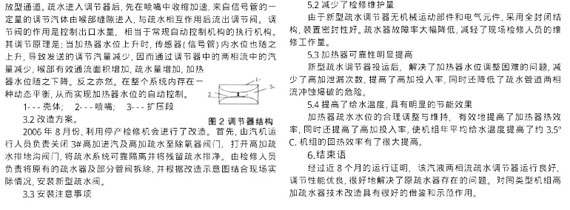 熱器水位信號( 液相)和調節(jié)用汽量信號輸水調節(jié)器系統(tǒng)原理圖(汽相),進入調節(jié)器, 完成常規(guī)自動控制中測量、變送、給定值設定、偏差比較、放大運算等功能。調節(jié)器由殼體、噴嘴、擴壓段組成,噴嘴和擴壓段組成縮放型通道。疏水進入調節(jié)器后,先在噴嘴中收縮加速,來自信號管的一定量的調節(jié)汽體由喉部縫隙進入,與疏水相互作用后流出調節(jié)閥。調節(jié)閥的作用是控制出口水量,相當于常規(guī)自動控制機構的執(zhí)行機構。其調節(jié)原理是:當加熱器水位上升時,傳感器( 信號管)內水位也隨之上升,導致發(fā)送的調節(jié)汽量減少,因而通過調節(jié)器中的兩相流中的汽量減少,喉部有效通流面積增加,疏水量增加,加熱等。